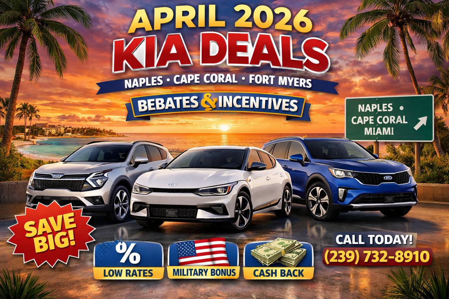 To start exploring current offers and view our extensive selection, plan your visit by getting directions to Airport Kia of Naples or call us directly at (239) 732-8910 for personalized assistance. We look forward to helping you take advantage of April’s rebates and incentives, ensuring a rewarding vehicle purchase experience.